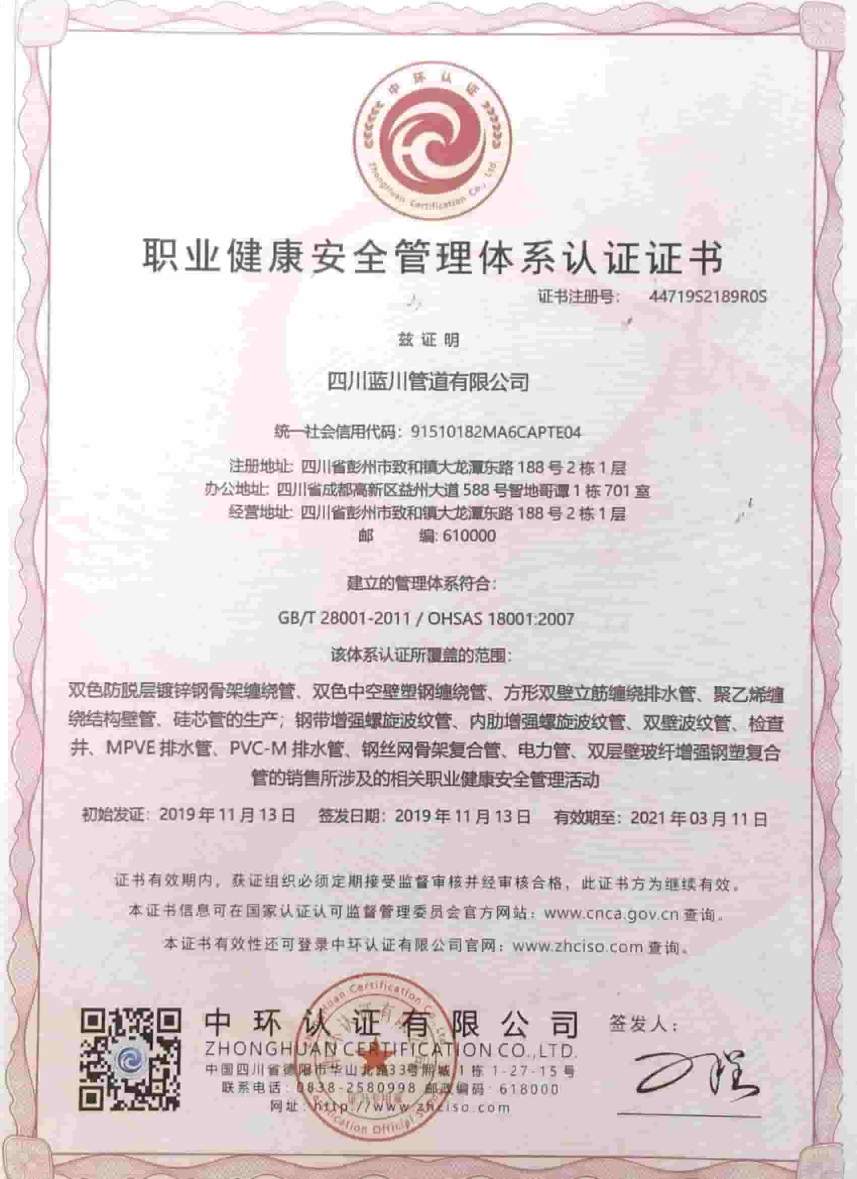 四川藍川管道有限公司(成都藍川科技有限公司)成立于2012年,生產基地坐落于“牡丹之城”四川彭州市工業開發區,營運中心位于成都市高新區益州大道,注冊資本5仟萬,占地面積2萬余平米,年生產能力達1萬噸以上;是一家專業研發、生產、銷售新型市政工程管道的高新技術企業。目前擁有大型市政排水管生產線5條,給水管生產線5條,電力管生產線2條。主要產品有:防脫層鍍鋅鋼骨架纏繞管、雙層壁克拉管、雙色中空壁塑鋼纏繞管、方形雙壁立筋纏繞管、內肋管、雙壁波紋管、給水管、電力管、硅芯管等。 公司是四川省湖南商會“常務副會長單位”和“創新湘商”,中國塑料加工工業協會“塑料管道專業委員會會員單位”,獲得了30余項發明專利和實用新型專利,2020年評為《高新技術企業》,公司通過了《質量管理體系認證證書ISO9001:2015》,《職業健康安全管理體系認證證書OHSAS18001:2018》,《環境管理體系認證證書ISO14001:2015》;公司于2019年主編了《雙色防脫層玻璃纖維增強鍍鋅鋼骨架纏繞管》T/SCSX0906-2019,《雙壁纖維網鋼塑復合管》T/SCSX0916-2019,兩項團體標準,并獲得了四川建設科技發展中心頒發的《四川省建設領域科技成果或應用技術備案證書》;公司“藍川”牌雙孔雙色共擠中空壁塑鋼纏繞聚乙烯管道、GSRC雙色雙層共擠玻纖增強防脫層鍍鋅鋼骨架纏繞管、方形雙壁立筋纏繞管、玻璃纖維增強內肋硅芯層塑料電纜導管系列產品多次被中國企業發展促進委員會、中國優質品牌統計中評定為“綠色環保推薦企業”、“工程建設推薦產品”、“質量.服務誠信AAA企業”、“質量檢驗.國家標準合格產品”、“中國自主創新產品”。